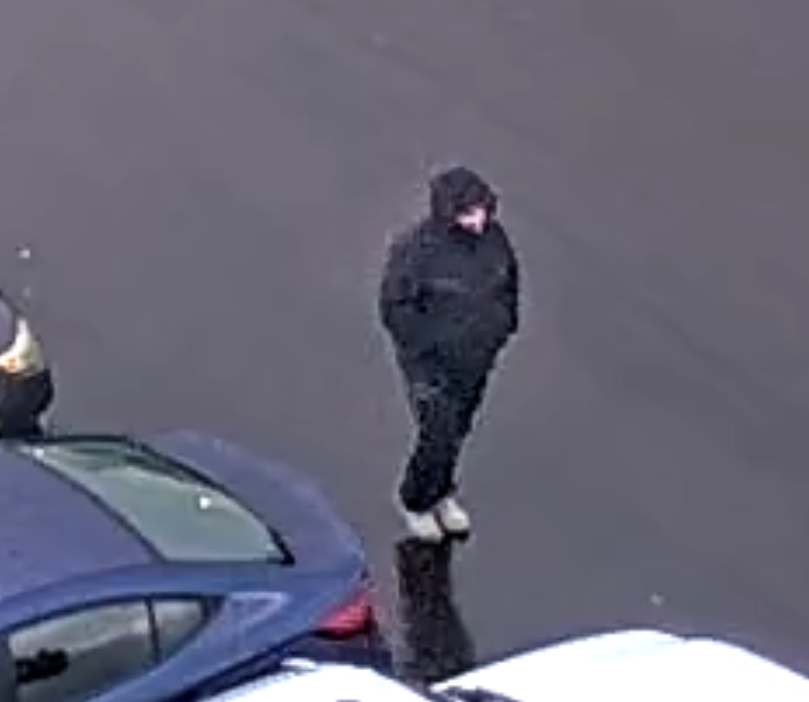 El sospechoso llevaba una chaqueta negra con capucha, un gorro negro, zapatos blancos y una mascarilla facial rosa o morada.