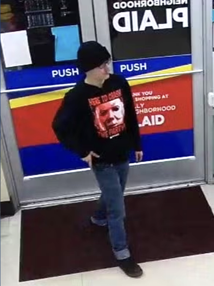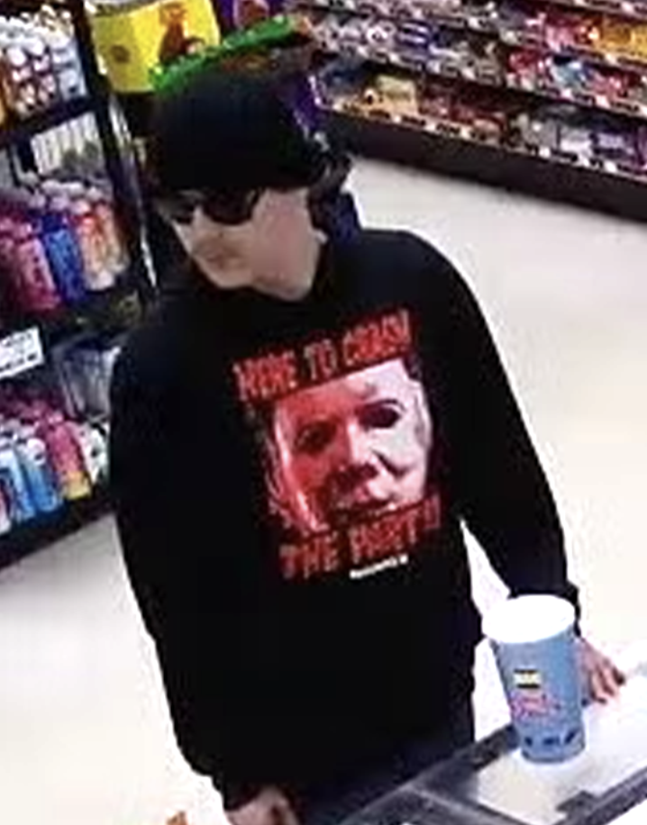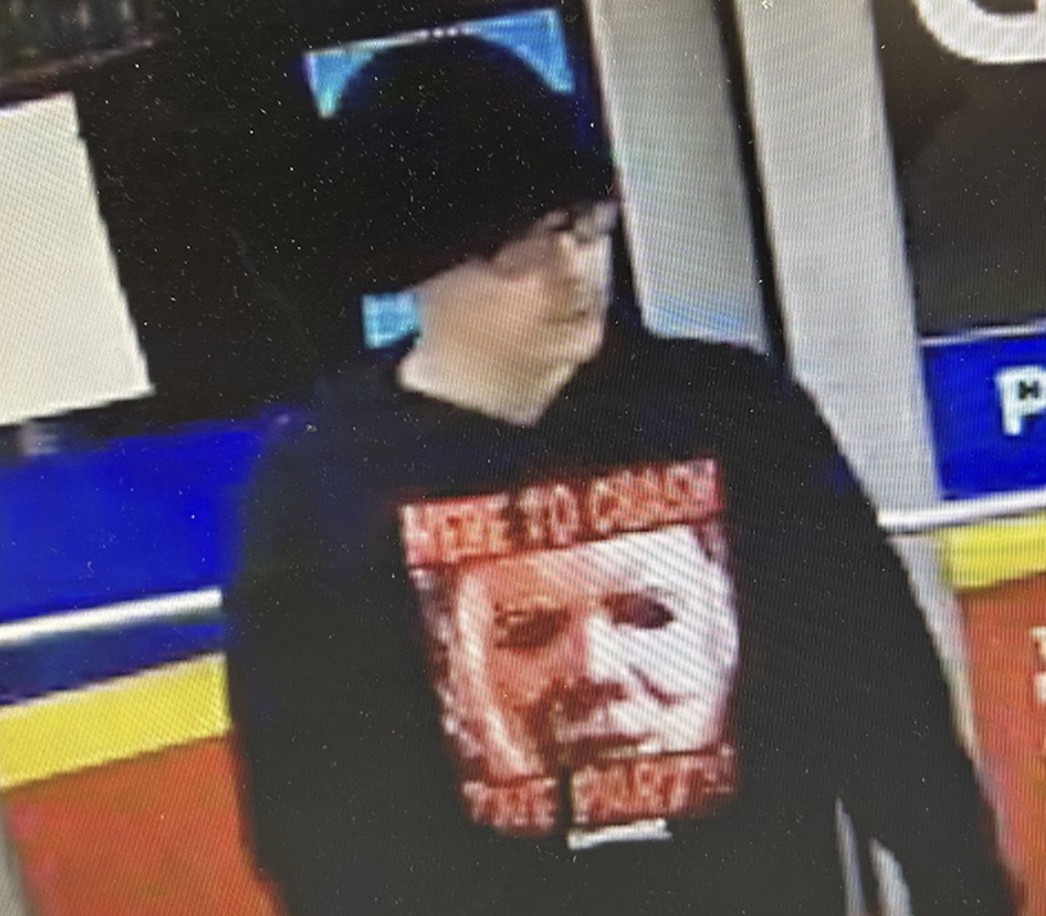 El sospechoso vestía un gorro de lana negro, lentes negros, una sudadera negra con motivos de Halloween con la imagen de Michael Myers y la frase “Here to crash the party” (Vengo a arruinar la fiesta), pantalones de mezclilla azules y calzado negro.