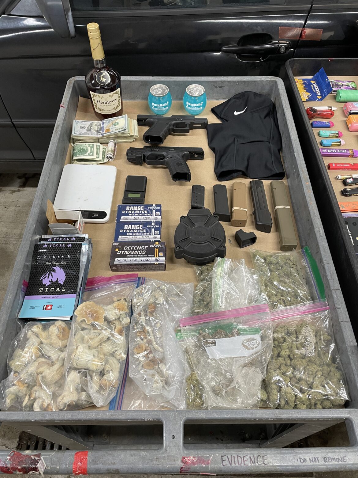 Los oficiales incautaron más de $200,000 en efectivo, armas, una cantidad de productos para vapear, hongos alucinógenos y marihuana. También encontraron una máscara de esquí y morrales.