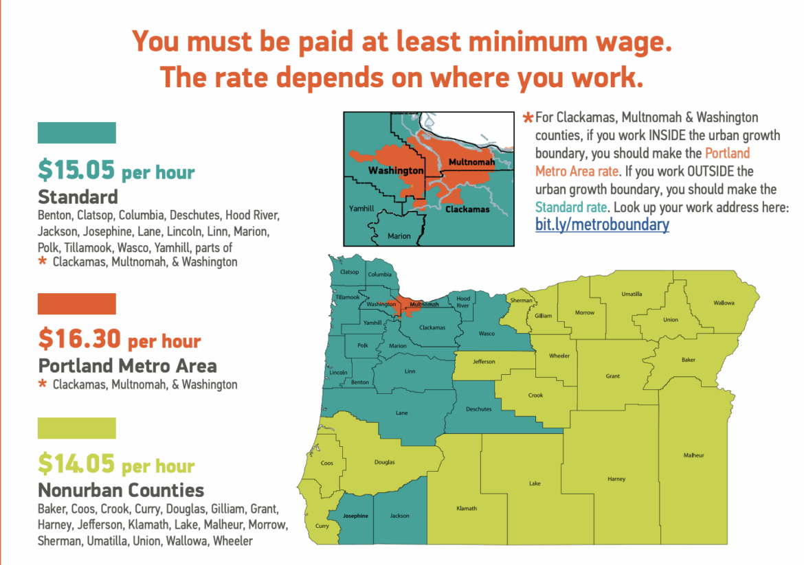 Las tarifas actuales del salario mínimo son las siguientes: $15.05 para la tarifa estándar, $16.30 para el área metropolitana de Portland y $14.05 para los condados no urbanos.